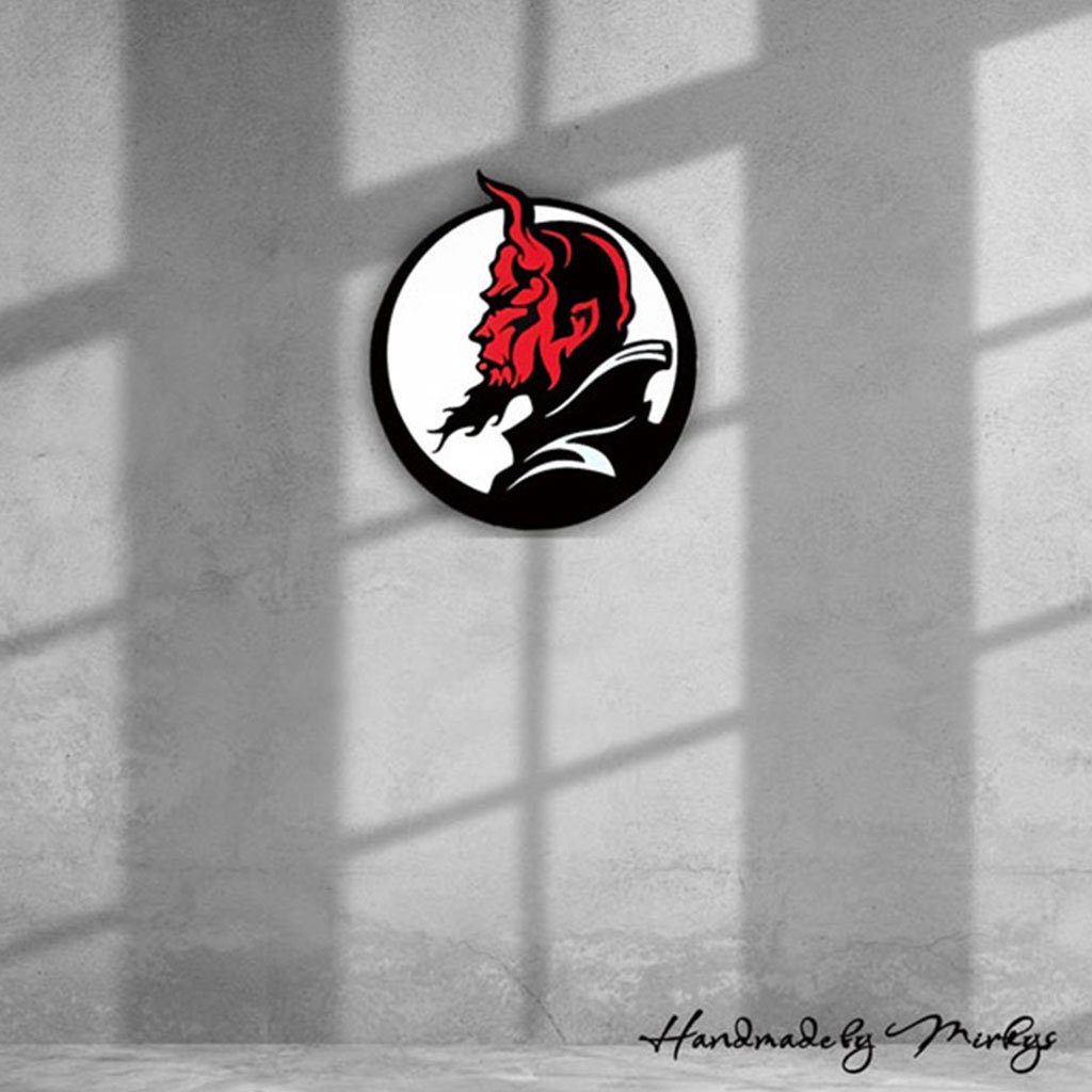 Tento ručně vyrobený obraz zobrazuje stylizovaný profil rudého ďábla s výraznými rohy, kozí bradkou a přísným pohledem. Motiv je zasazen do kruhového formátu s bílým pozadím a černým rámečkem, což vytváří silný vizuální kontrast. Ideální dekorace pro milovníky alternativního umění, sběratele nebo jako výrazný prvek do moderního interiéru.