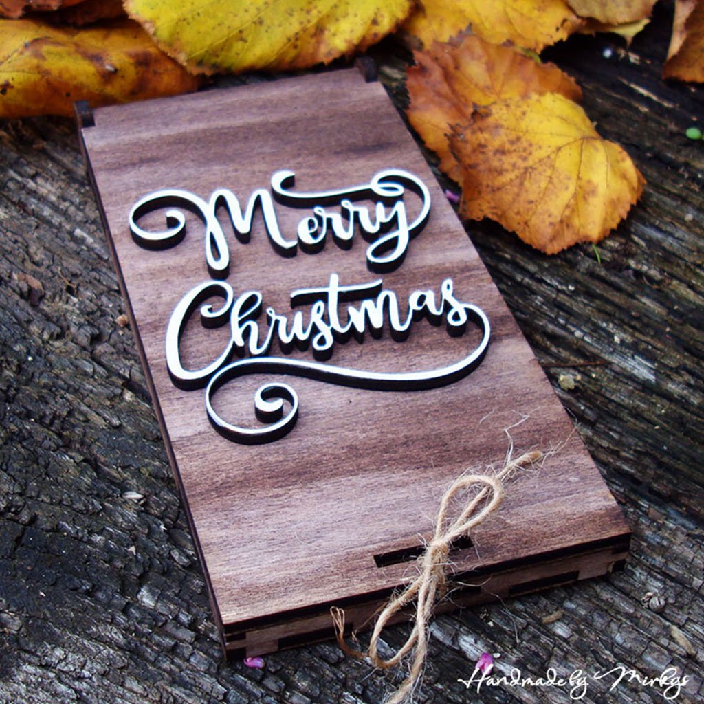 Ručně vyráběná dřevěná krabička s nápisem „Merry Christmas“ – originální obal na peníze, poukazy nebo dárkových poukazů. Stylový způsob, jak darovat vánoční radost.