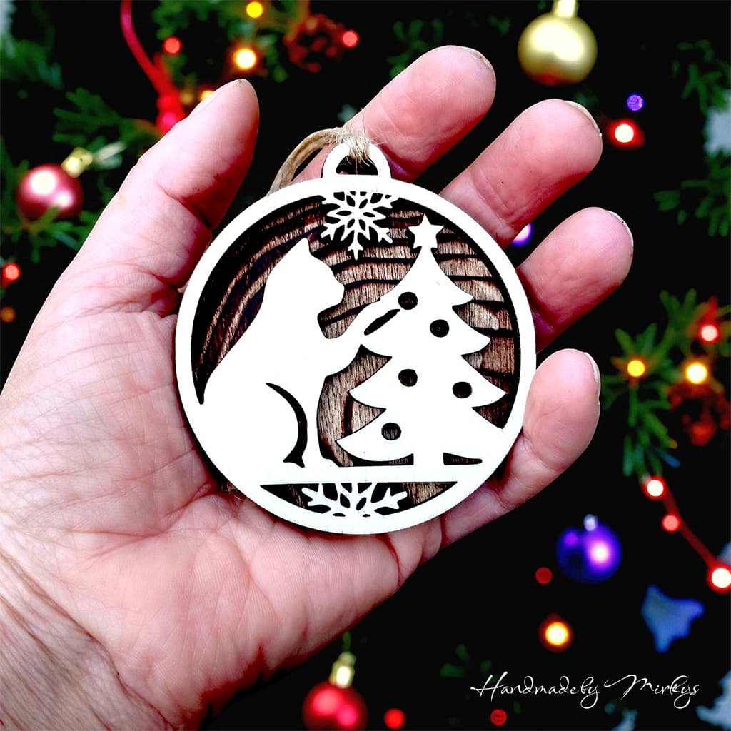 Sada dřevěných vánočních ozdob s kočičkou a stromečkem