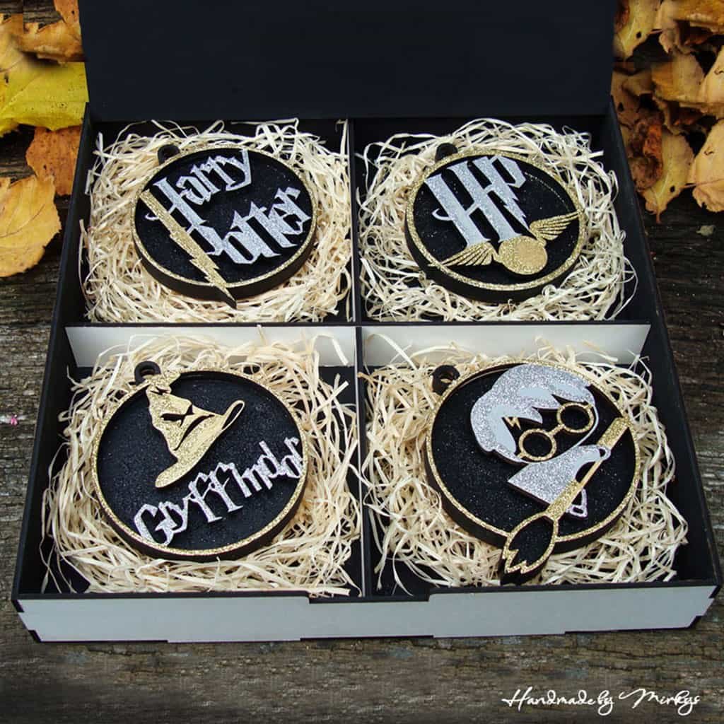Originální dřevěné vánoční ozdoby s motivem Harryho Pottera, jsou složeny ze dvou vrstev 4mm topolové překližky, ručně malované zdravotně nezávadnými barvami a zdobené glitry.