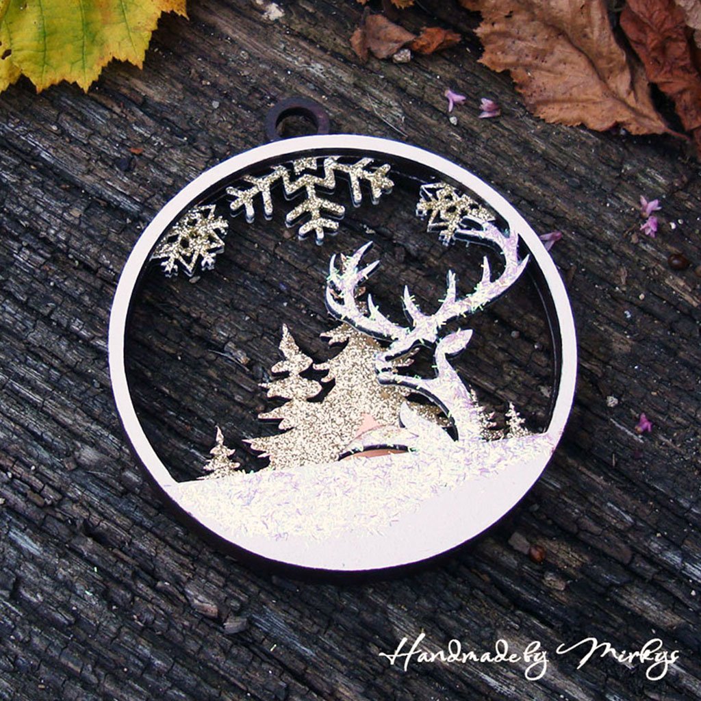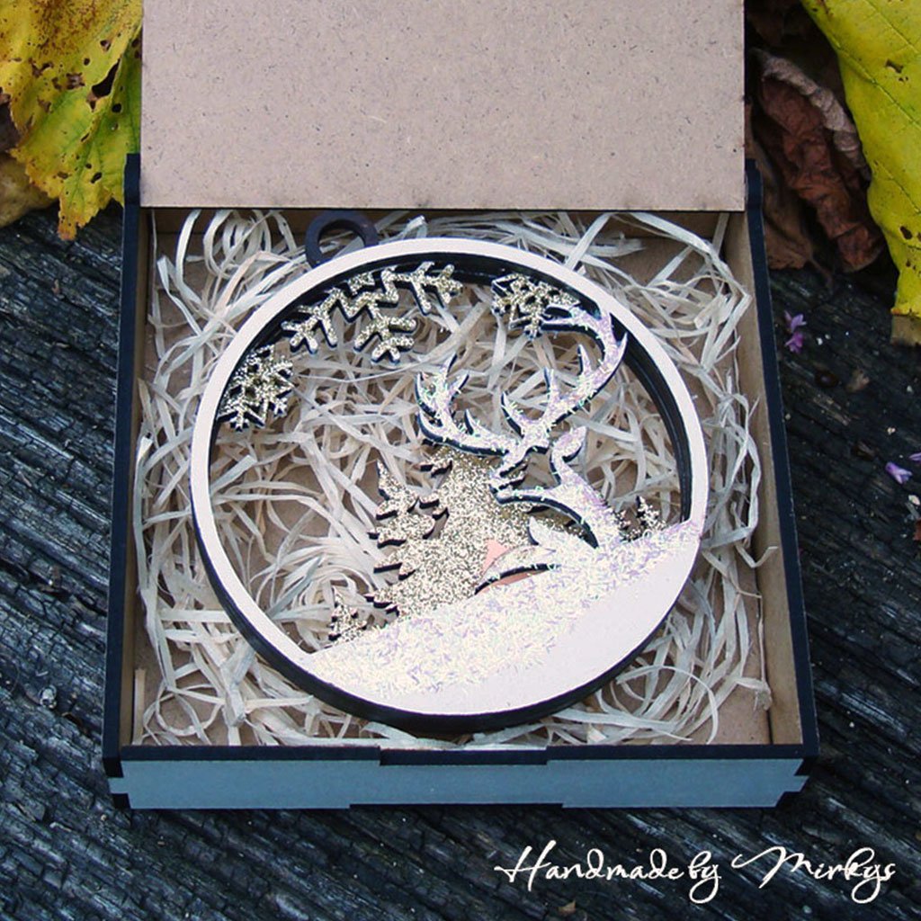 Vneste do svého domova kouzlo zimní pohádky s touto originální dřevěnou vánoční ozdobou. Silueta třpytivého jelena mezi zasněženými stromy je precizně vyřezaná laserem a ručně dokončená s láskou k detailu. Každý kus je jedinečný – vyrobený z kvalitního dřeva, barvený nezávadnými barvami. Skvělý doplněk na vánoční stromeček, věnec nebo jako malý dárek, který potěší srdce i oko.
