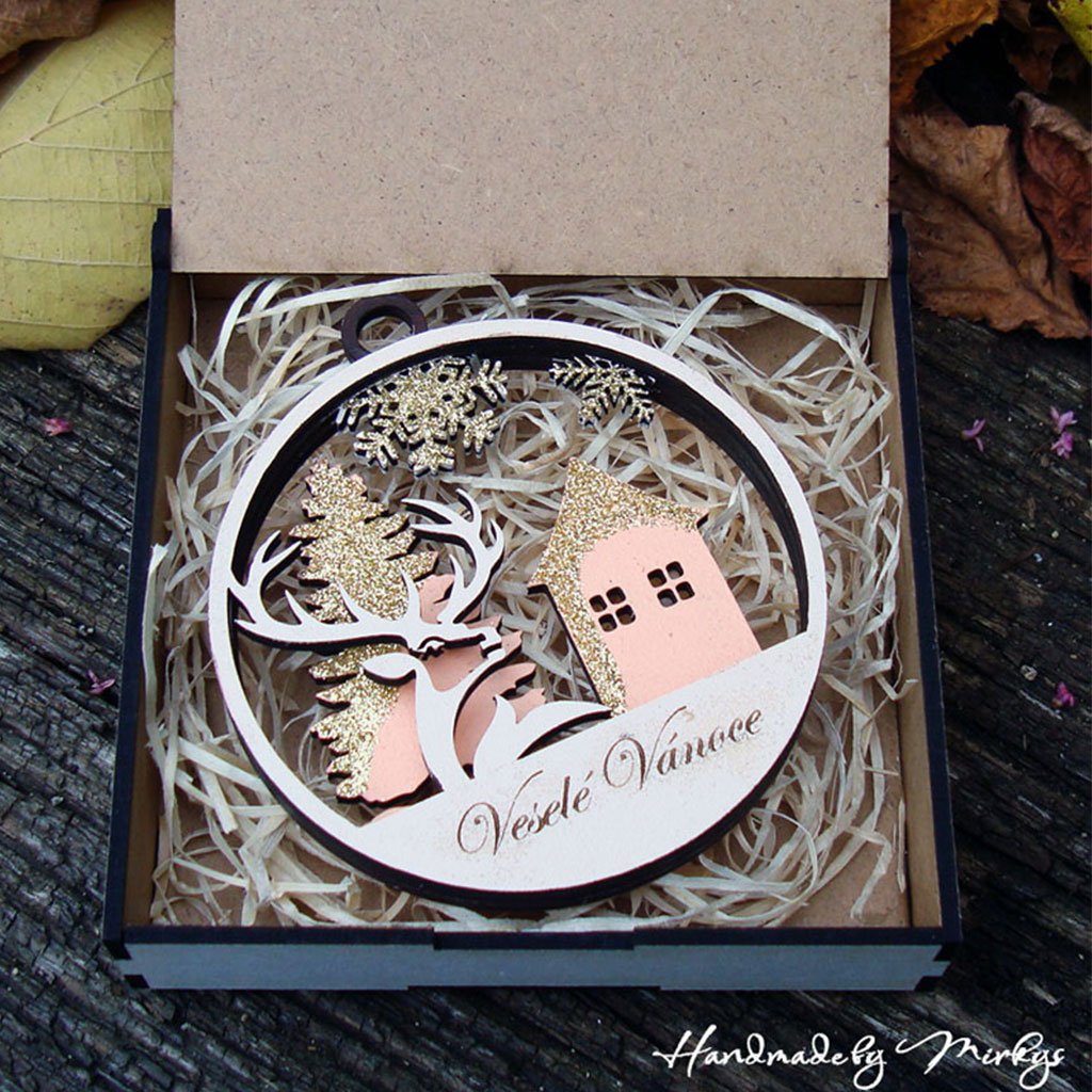 Vánoční ozdoba, která zahřeje u srdce. Tento ručně vyráběný kousek spojuje jemnost dřeva, třpytivé detaily a poetickou zimní scénu s jelenem, domečkem a zlatými sněhovými vločkami. Nápis „Veselé Vánoce“ dodává osobní kouzlo a připomíná krásu českých tradic. Každý ornament je pečlivě vyřezán, zdoben nezávadnými barvami a připraven rozzářit váš stromeček nebo potěšit jako dárek.