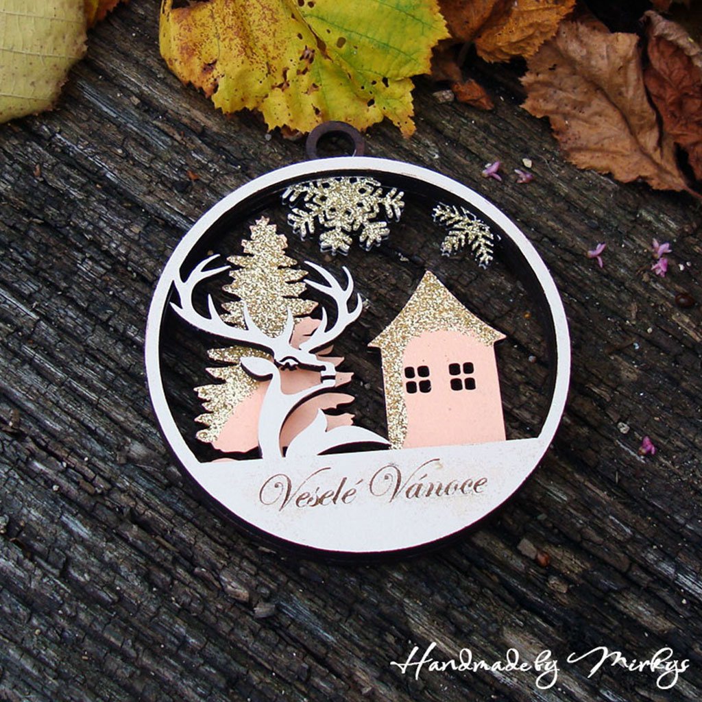 Ručně vyráběná dřevěná ozdoba s jelenem, domečkem a nápisem „Veselé Vánoce“. Třpytivé detaily, české kouzlo a láska k tradici.