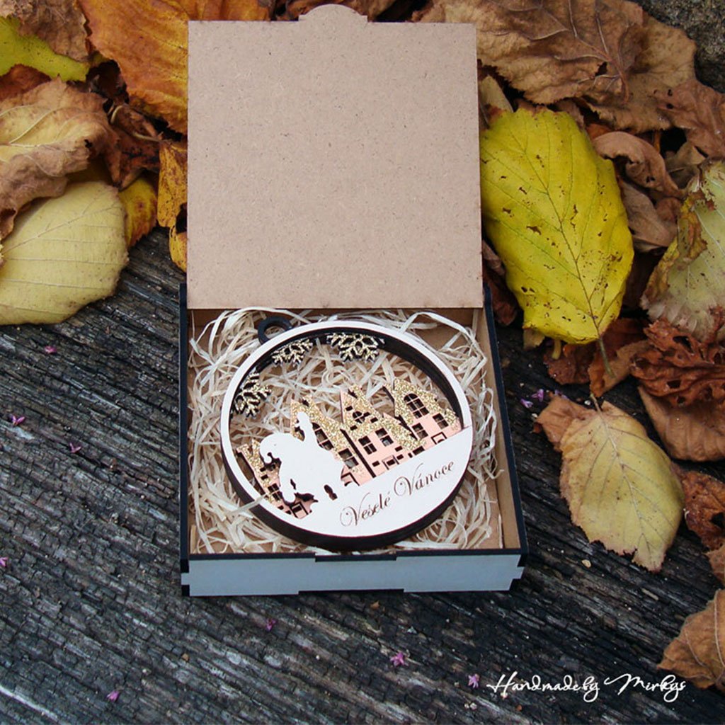 Ručně vyráběná dřevěná ozdoba s jelenem, domečkem a nápisem „Veselé Vánoce“. Třpytivé detaily, české kouzlo a láska k tradici. Velikost krabičky: 13 x 13 cm Velikost...
