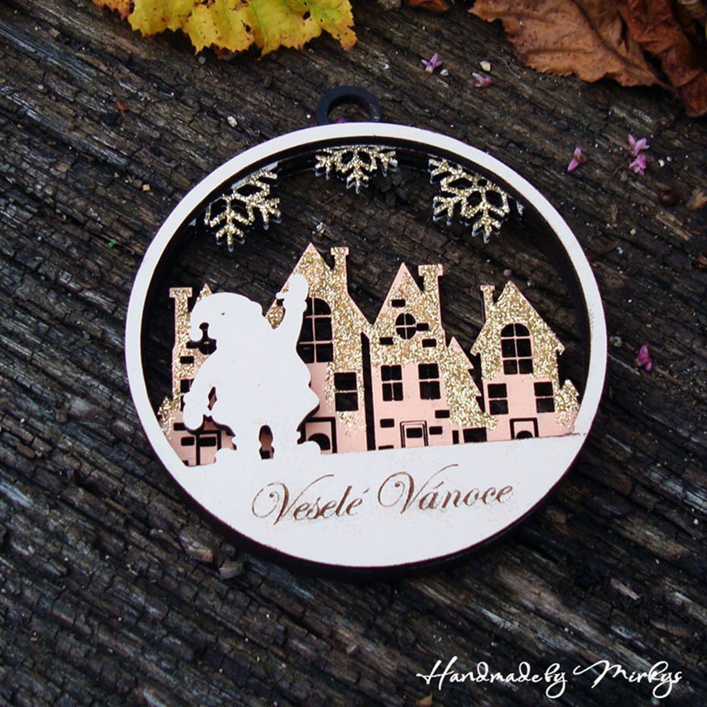 Třívrstvá ručně vyráběná dřevěná ozdoba s Mikulášem, domečky a vločkami. Třpytivé detaily a české „Veselé Vánoce“ v každém výřezu.
