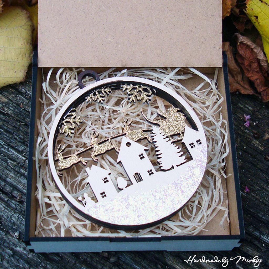 Třívrstvá ručně vyráběná dřevěná ozdoba s Mikulášem na saních, soby a zasněženou vesničkou. Třpytivé detaily a kouzlo Vánoc v každém výřezu.